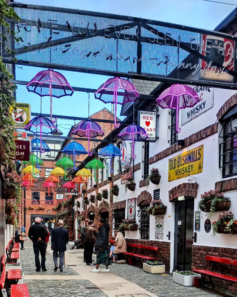 Commercial Court is a narrow cobbled alleyway in the Cathedral Quarter off Hill Street (Near The Dirty Onion) lined with traditional pubs and brightly coloured umbrella’s hanging above the street below.