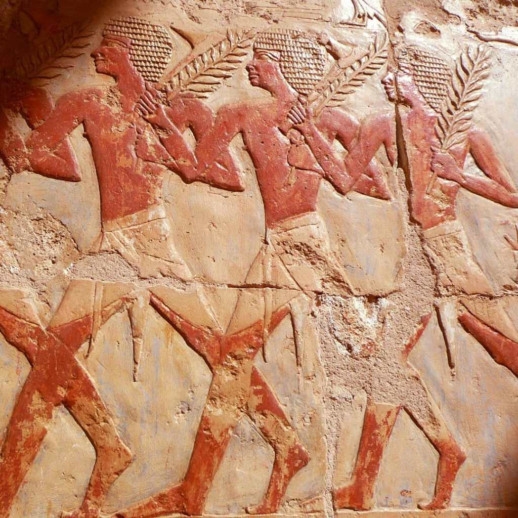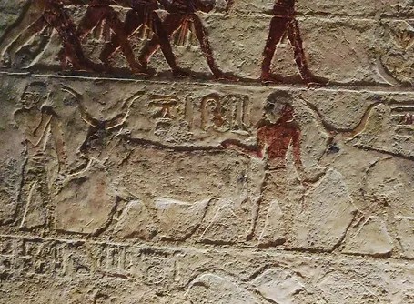 This relief from the tomb of Ti in Saqqara shows some workers who work in the construction of a ship. Ti was supervisor of the pyramids of Niuserre, Pharaoh of the 5th dynasty.