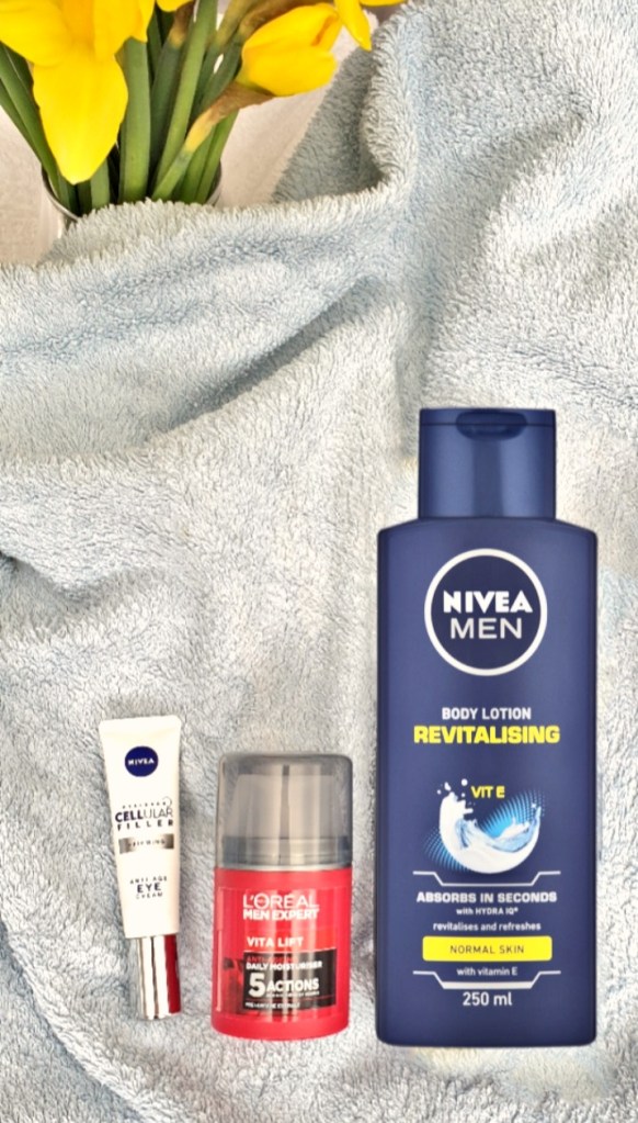 For my face I use L’Oreal Men Vita Lift daily moisturiser then apply a small amount of sunscreen over it once it has absorbed. For the body I use Nivea Body Lotion. I tend to find the Nivea body range less greasy than some other brands on the market.
