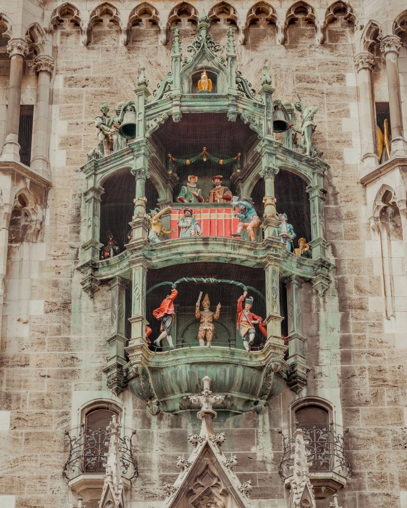 Munichโs town hall (the Neues Rathaus) in Marienplatz was completed in 1874 and is now the focal point of the city. Its main attraction is the Glockenspiel clock, with its 43 bells, that chimes each day at 11am, 12pm, and 5pm with 32 life sized figurines narrating 16th Century stories about Munichโs history, twirling around in a fun show each time the clock chimes.