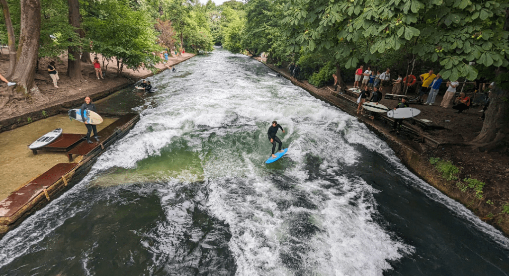 Near the entrance to the garden on the river Eisbach adjacent to John F. Kennedy Bridge there is an air of coolness were people can surf as the water flows out under the bridge. Thereโs also a great beer garden in the center too with a Chinese pagoda.