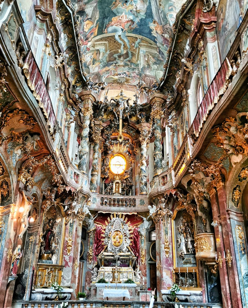 The Asam Church, built between 1733-1746, is named for its 18th Century designers, the Asam brothers. Its interior is extravagant. The church is small but the brothers made use of every inch of the interior covering the confined space in statues and paintings. Admission is free.
