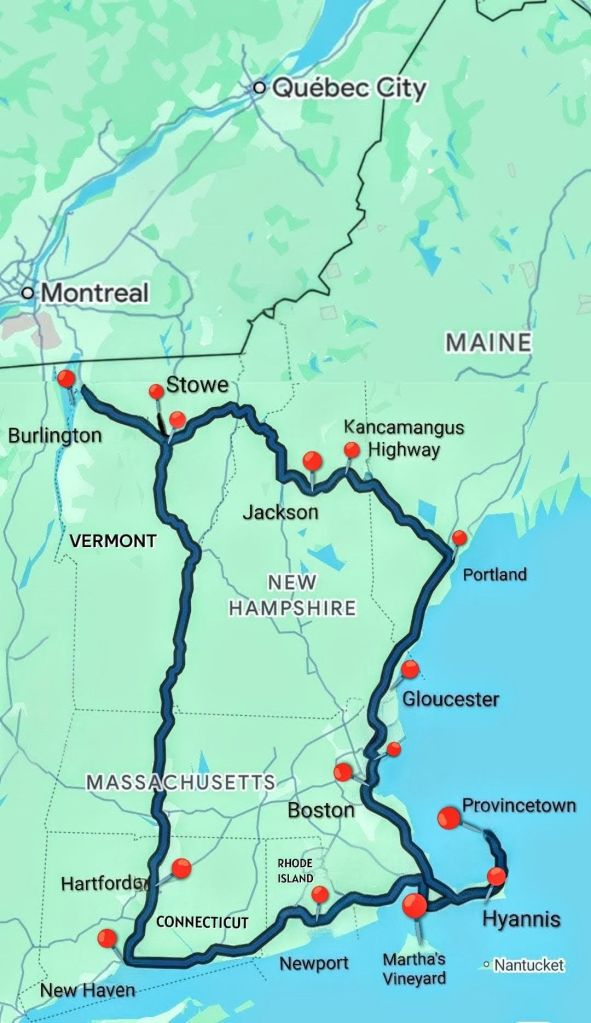 Navigating anti-clockwise, the road trip would kick off with me barreling north out of Boston, steering through various towns in Massachusetts before plunging into the coastal city of Portland, Maine. From there I’ll veer west into the wilderness of New Hampshire and push further into the landscapes of Vermont. But wait! The adventure doesn’t stop there; turning the car due south out of Vermont, navigating my way back through Massachusetts, and into Connecticut. Just when you think it was over, Iโll swing the car east into the minuscule state of Rhode Island, only to blast further east towards the enchanting Cape Cod, Martha’s Vineyard for those 1975 ‘Jaws’ location spots, veering north into Provincetown, before finally spinning 360โฐ to make my grand return to Boston – 1100 miles later.