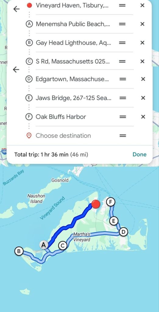 A day trip around Martha’s Vineyard is nothing short of an exhilarating adventure! For me, it unfolded as an action packed itinerary filled with iconic Jaws location sites and every moment was absolutely worth it. As the sun began to set, I capped off the day with a breathtaking ferry ride across the Vineyard Sound, back to Woods Hole from Oak Bluffs, a perfect finale to an unforgettable experience.