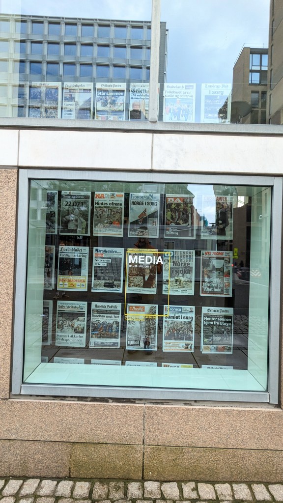 On a somewhat more thought provoking moment on Saturday 22nd July 2011 an extremist Anders Breivik drove a van to the Government Office Complex in the centre of Oslo which killed eight people. Later that afternoon 69 people were killed in a mass shooting on Utรธya island. On the adjacent street to where the bomb exploded there is a small window memorial on Teatergata Street.