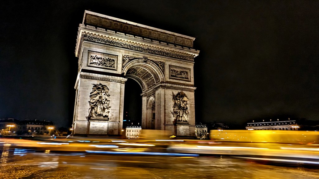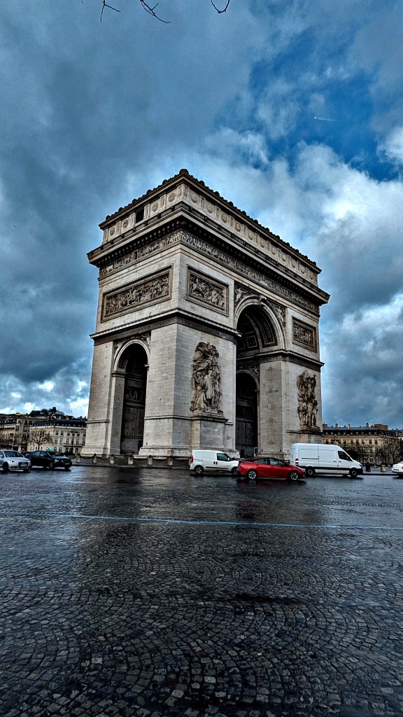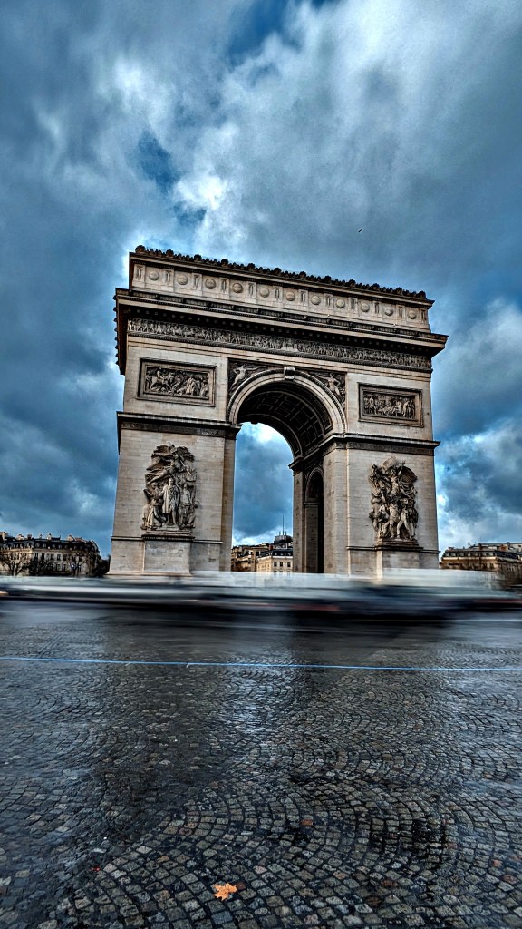 The Arc de Triomphe was commissioned by Napolean in 1806 to celebrate his victory at the Battle of Austerlitz. Located at one end of the Champs-Elysees opens to a busy street lined with trees on both sides