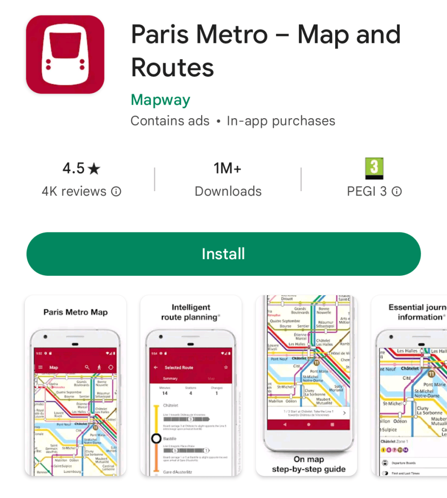 A very useful tool to download before you travel is ‘Paris Metro – Maps and Routes’ (Google Play store) app. It allows you to enter a start and end Metro station and advises you of what Metro line to take, what colour line, and where to change, if required. Absolutely proved an invaluable tool.