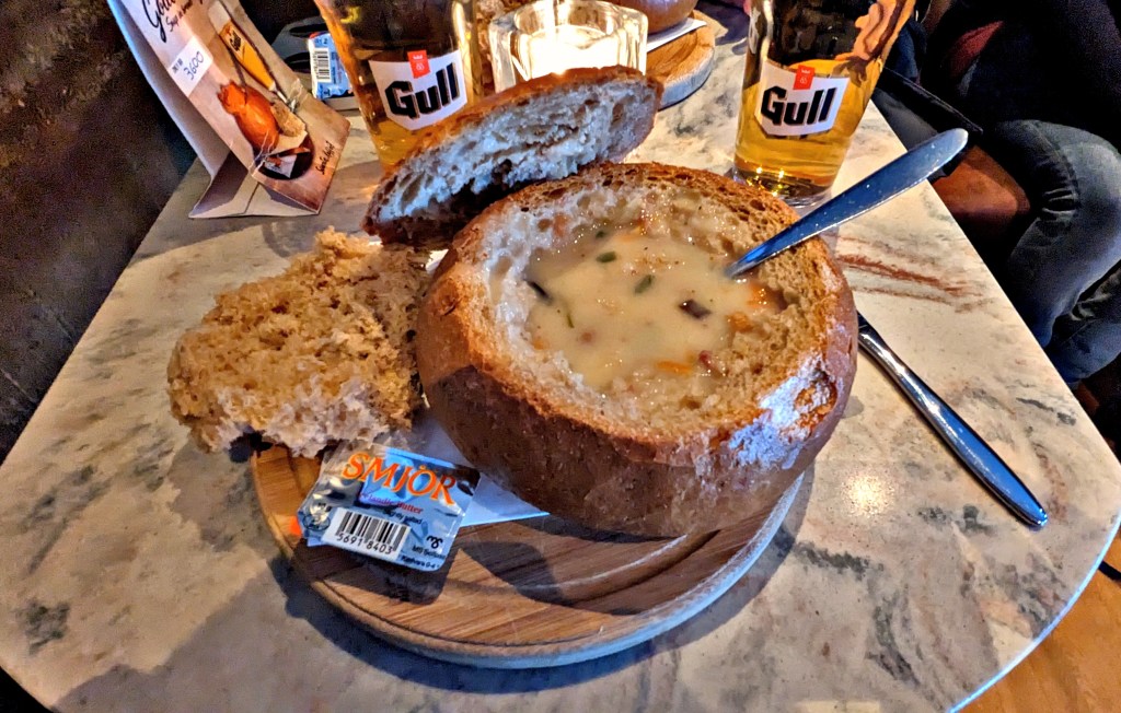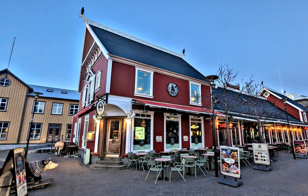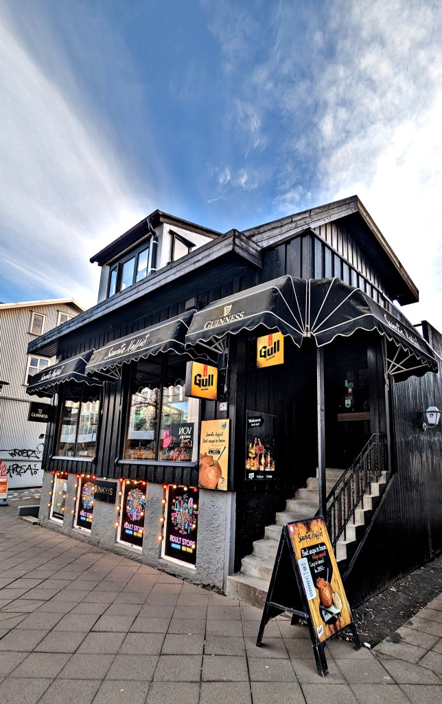 This has to feature highly as one of my favourite venues to eat. Located on the main high street – Laugavegur Street. This restaurant only offers two types of soup (choice of meat or vegetable) and is served in hollowed out soda bread served with a drink. Extremely tasty and filling. All meals are ISK Kr3600 (GBยฃ21/US$25.75)
