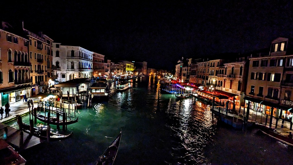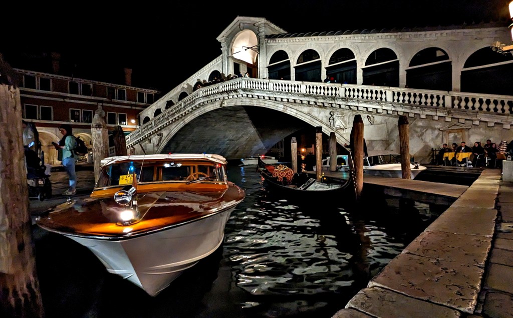The Rialto Bridge is a main water bus hub and has several pontoon’s along its bank.