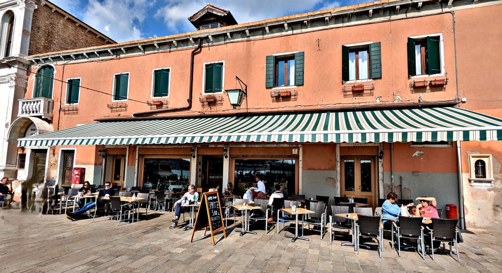 Located at Strada Nova, 4378, 30121 opposite the Zattere Vaparetto (water bus) stop offers views out towards San Giorgio island. It’s a great little place to grab lunch with a beer or Aperol Spritzer watching the world pass by.